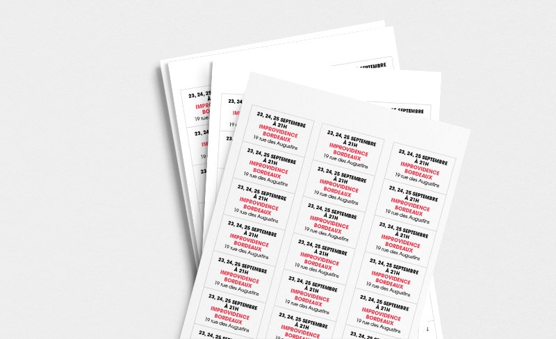 Astuce : je réserve un rectangle vide, de la taille d’étiquettes d’adresses pour enveloppes. On peut en imprimer chez soi, ce sont des A4 avec 24 étiquettes pour ma part. Et j’imprime séparément les étiquettes, en petites quantités et à la demande. On joue à Paris, hop 10 planches d’étiquettes. Bordeaux ? 5 planches + des vierges dans mes bagages à imprimer si nécessaire.